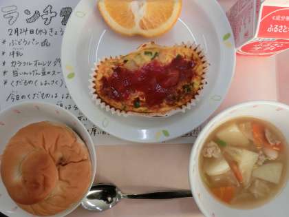 今日の給食は、ブドウパン、牛乳、カラフルオムレツ、白インゲン豆のスープ、くだもの(八朔)です。