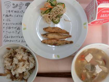 今日の給食は、豚肉とごぼうのごはん、牛乳、わかさぎのから揚げ、大根サラダ、さつまいも汁です。