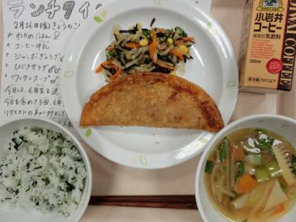 今日の給食は、わかめごはん、コーヒー牛乳、ひじきのサラダ、ワンタンスープです。