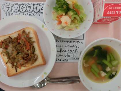 今日の給食は、きんぴらトースト、牛乳、花野菜のサラダ、ABCスープです。