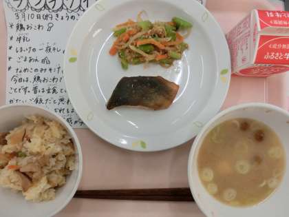 今日の給食は、鶏おこわ、牛乳、ほっけの一夜干し、ごまあえ、なめこのみそ汁です。