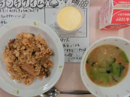 今日の給食は、キムチチャーハン、牛乳、中華コーンスープ、手作りプリンです。