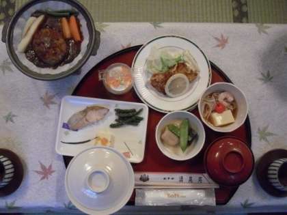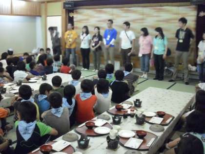 開園式の最後に、それぞれの先生が紹介されました。その後、部屋に入り、避難訓練、荷物の整理、入浴を済ませ、夕食になりました。メニューは、ハンバーグ、鶏のから揚げ、マカロニサラダ、温キャベツ、日光湯波、白身魚の西京焼き、玉子豆腐、ワカメ汁、ゼリー、ご飯と豪華でした。