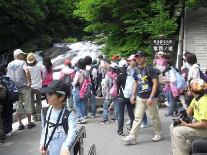 川の水に濡れるハプニングもありましたが、しゃくなげ橋に着いて、竜頭の滝を見学し、船に乗りました。桟橋で船を待つ間に、トンボが指に止まってくれました。