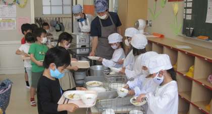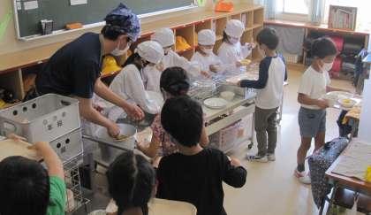 衛生管理のもと、自分たちで協力して給食の準備をしているとろです。給食当番の活動にも慣れてきました。