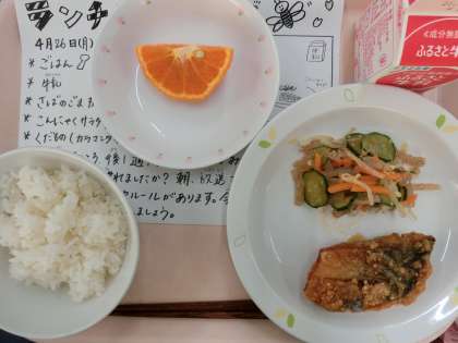 今日の給食は、ごはん、牛乳、さばのごま揚げ、こんにゃくサラダ、くだもの(〜マンダリン)です。