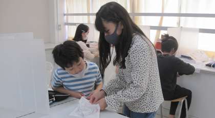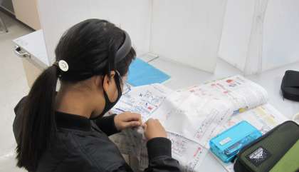 「なみぬい、本返しぬい、半返しぬい」の縫い方、「玉どめ」の作り方について学習しましまた。練習布を使って教え合いながら、技能を高めていました。