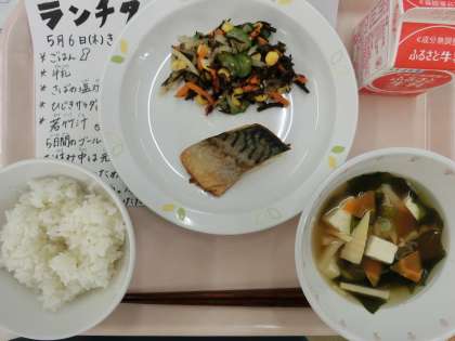 今日の給食は、ごはん、牛乳、さばの塩焼き、ひじきサラダ、若竹汁です。