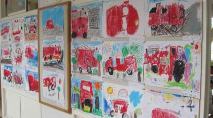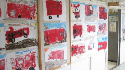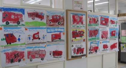 消防写生会で描いた絵を廊下に掲示し、お互いに見合っています。