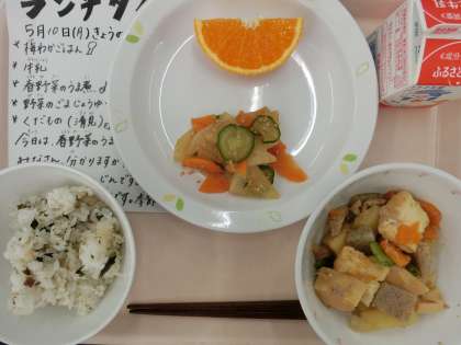 今日の給食は、梅わかごはん、牛乳、春野菜のうま煮、野菜のごま醤油づけ、くだもの(清美オレンジ) です。