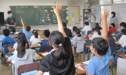 課題「種子が発芽する条件を考えよう」 調べる条件、実験方法を考えました。指先まで伸びた挙手にはやる気を感じます。