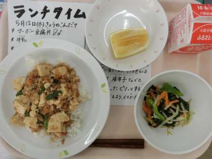 今日の給食は、麻婆豆腐丼、牛乳、ナムル、くだもの(ジューシーフルーツ)です。