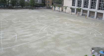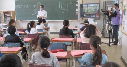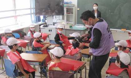 開校60周年記念の航空写真撮影を行いました。業者の方は、7時前から校庭で準備を進めていました。教室では、担任が撮影の流れや立つ位置について説明しました。