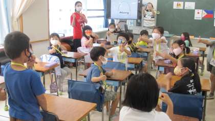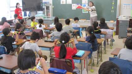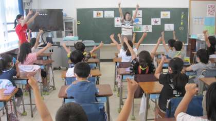 担任とALTがティームティーチングで授業をしています。あいさつをして、自分が好きな色、キャラクターについて英語で話しました。映像クイズは盛り上がっていました。正解した子は、ジェスチャー付きでみんなに英語でほめられていました。
