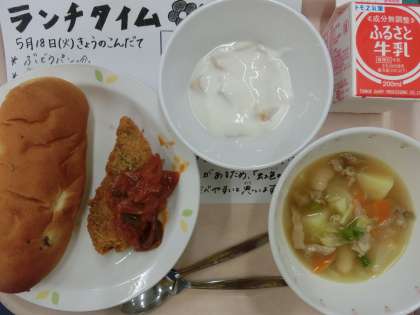 今日の給食は、ぶどうパン、牛乳、魚のフライマッシュルームソース、白インゲン豆のスープ、フルーツヨーグルトです。