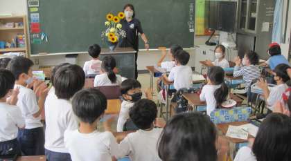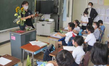 クラスの児童が家から持ってきてくれた花を担任が、生け花として表現しました。解説をしながら植えていき、短時間ですてきな作品が仕上がりました。作品をゆっくり回転させて子どもたちの方へ向けると、拍手と歓声が沸き上がりました。