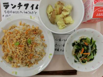 今日の給食は、四色そぼろ丼、牛乳、野菜のからし醤油かけ、じゃがバターです。