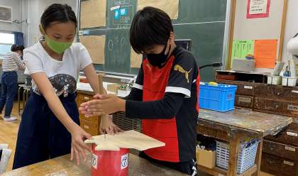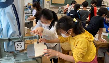 「ココロ仮面」の作品づくりをしています。電動糸のこぎりや千枚通し、紙やすり等を使い、友達と協力して取り組んでいます。振り返りカードに子どもたちは「電ノコと仲良くなれました。曲がるところを切るコツがつかめました。」「電ノコを使うのは、はじめはこわかったけど、楽しくなってきました。」等、向上したことや楽しく活動していることを記述していました。