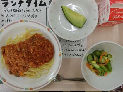 今日の給食は、スパゲティミートソース、牛乳、アスパラガスのサラダ、くだもの(メロン)です。