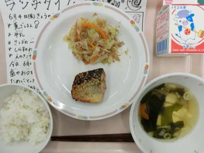 今日の給食は、麦ごはん、牛乳、さばの一味焼き、しらすとキャベツのおひたし、えのき汁です。