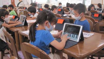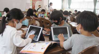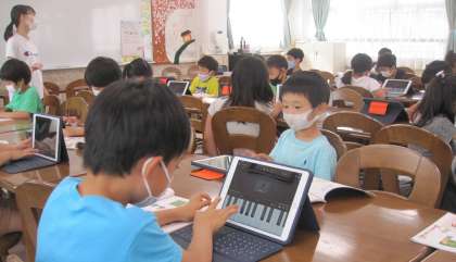 「ドレミの歌」の演奏に挑戦しています。iPadを活用し、指使いの練習をしました。