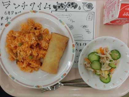 今日の給食は、チキンライス、牛乳、ベーコンチーズポテトパイ、ツナと大根のサラダです。