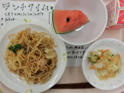 今日の給食は、五目焼きそば、牛乳、ぱりぱりサラダ、くだもの(小玉すいか)です。