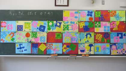 「ちょっきん ぱっ で かざろう」 紙の折り方や切り方を工夫して作成しました。