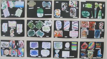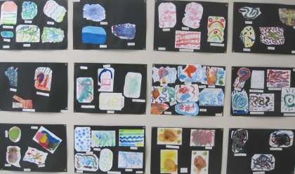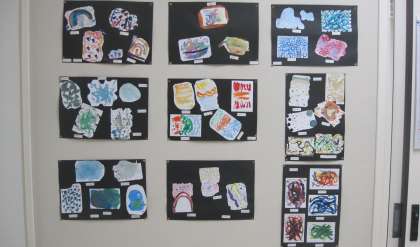 「えのぐLABO」えのぐでどんなことができるかな?と、考えながら、えのぐの研究をしました。「混ぜたらこんな色ができた!」「きれいににじんだよ!」とたくさんの発見がありました。作品が完成した時に、色合いや形からイメージを広げて、題名をつけました。写真は職員室前に掲示している作品です。