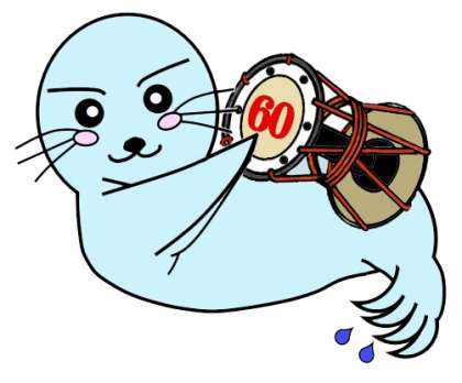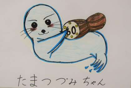 マスコットの「たまつづみちゃん」は、多摩川を泳ぐ、あざらしのたまちゃんをモチーフに、つづみを持たせて「たまつづみ」と考えたデザインだそうです。「たまづつみ」に似ていますね。このマスコットとシンボルマークは、開校60周年の記念に様々な場面で使用していきます。