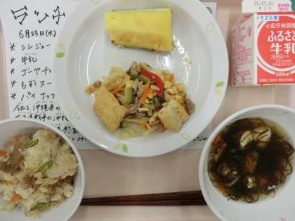 今日の給食は、シシジューシー、牛乳、ゴーヤチャンプルー、もずくスープ、くだもの(パイナップル)です。