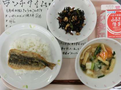 今日の給食は、いわしのかば焼き、牛乳、ひじきの煮つけ、吉野汁です。