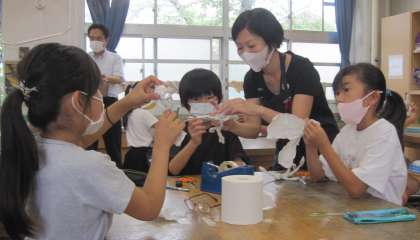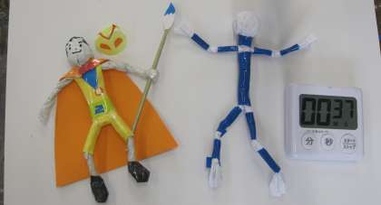 今日の課題は「自分だけのくしゃくしゃヒーローをつくろう!」です。A4の紙をくしゃくしゃにして、感触を味わいながら柔らかくしていきました。次に、パーツごとにテープで巻いて人間の形にしていきます。これを『関節くん』と呼んでいました。どんなヒーローにしようか、イメージを広げながら考え、作成していました。写真は、教師が見本で提示した、図工のヒーロー「ズッコーマン」「関節くん」です。