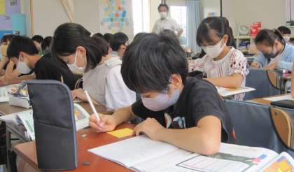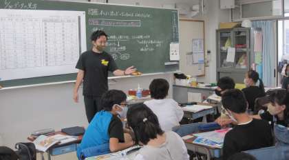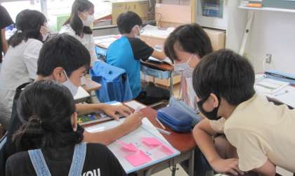 「読書チャンピオンを決めよう!」 始めに、1組と2組の読書記録の提示がありました。どちらのクラスがよく読書をしているのか、自分の考えを付箋に書き、それをもとにして、グループで読書記録を比べる様々な観点について話し合いました。