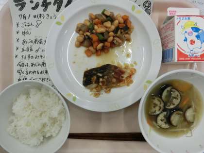 今日の給食は、ごはん、牛乳、あじの南蛮焼き、五目豆、なすのみそ汁です。