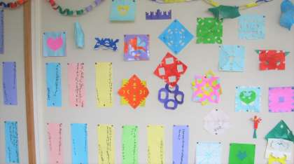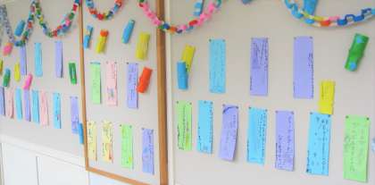 七夕飾りをつくり、短冊に願い事を書きました。微笑ましい願いごとがいっぱい!廊下の掲示板に掲示してあります。