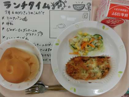 今日の給食は、ミルクパン、牛乳、じゃがいもとズッキーニのグラタン、ハニーサラダです。