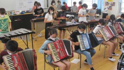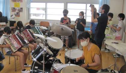 「キリマンジャロ」の合奏を披露してくれました。転校した児童が担当していたドラムは、音楽専科の教諭が担当し、転入生の2人も短時間の練習で、担当した楽器を見事に演奏していました。リズムに乗った迫力のある演奏が印象的でした。各クラスの演奏場面は、YouTubeで配信し、お知らせする予定です。
