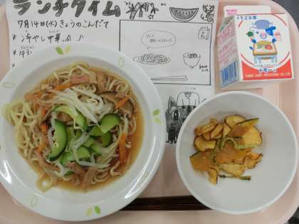 今日の給食は、冷やし中華、牛乳、夏野菜チップスです。
