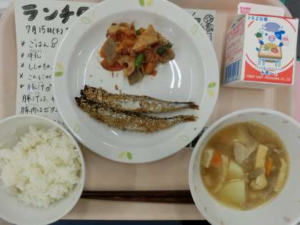 今日の給食は、ごはん、牛乳、ししゃものごま焼き、こんにゃくと野菜のおかか煮、豚汁です。