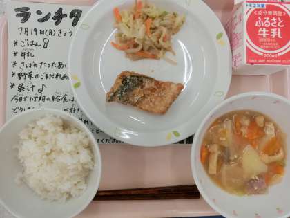 今日の給食は、ごはん、牛乳、さばの竜田揚げ、野菜のごまだれあえ、呉汁です。