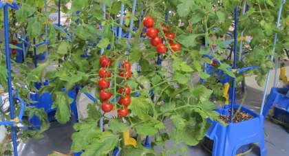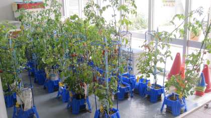 2年生が苗から大切に育てているミニトマトは、台風の影響に備えて、昇降口に移動しました。美味しそうな実がたくさんなっています。