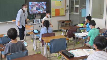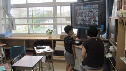 3年生は、それぞれのクラスの良さを発表し合いました。Zoomを活用し、家にいる子どもたちとも交流しました。