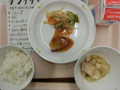今日の給食は、ごはん、牛乳、かつおの照り焼き、冬瓜と鶏肉の煮物、こんにゃくサラダです。
