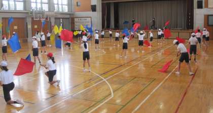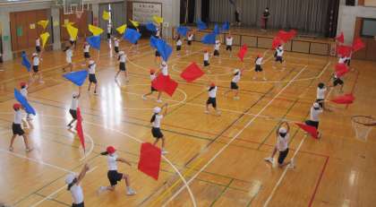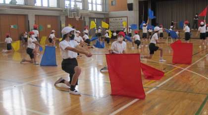 運動発表会に向けての練習がスタートしました。体育館でフラッグを操作する運動に取り組みました。