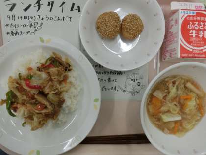 今日の給食は、ホイコーロー丼、牛乳、春雨スープ、さつまいも入りごま団子です。