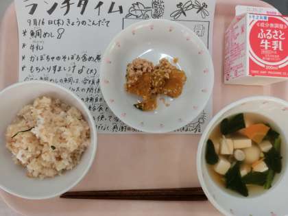 今日の給食は、鯛めし、牛乳、かぼちゃのそぼろ含め煮、もち入りすまし汁です。
