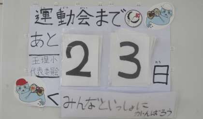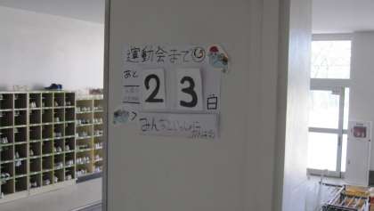 代表委員会の取り組みの一つで、運動発表会を盛り上げていこうと考えた当日までのカウントダウンです。図書室横と東昇降口に掲示してあります。