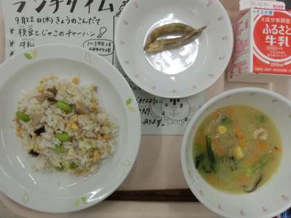 今日の給食は、枝豆とじゃこのチャーハン、牛乳、きびなごのからあげ、中華風コーンスープです。