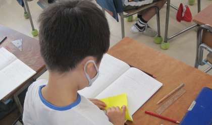 課題は「折り紙のような形について調べよう」です。特徴、辺の長さや角の大きさなどについて、操作活動を通して、気付いていきました。